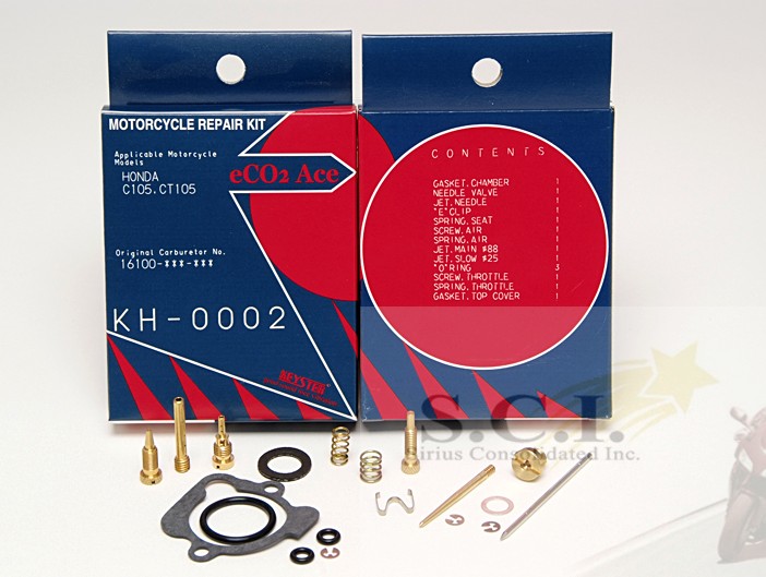 HONDA C105 CT105 TRAIL 55 KEYSTER CARBURETOR REBUILD REPAIR KIT 1962 - 1965 Part# KH-0002 Kit includes float bowl gasket; D1 slide needle and clip; alcohol resistant 1.2 float needle and seat; #88 main and #38 slow jet; air screw; idle screw and spring; misc packing and gaskets and "O" rings as shown
