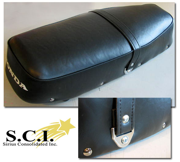 HONDA CB160 CL160 BLACK SPORT SEAT COVER BLACK 1965 - 1969 Part# CB160SCBLACK COMPLETE WITH: SILK SCREENED HONDA LOGO (with the larger old style FONT) BELT AND BUCKLES CHROME BUTTONS and ONE LAYER OF TERELYENE FOAM (in case your seat foam is damaged, this smooths it out) and installation instructions. Photos above is the cover on a completed seat