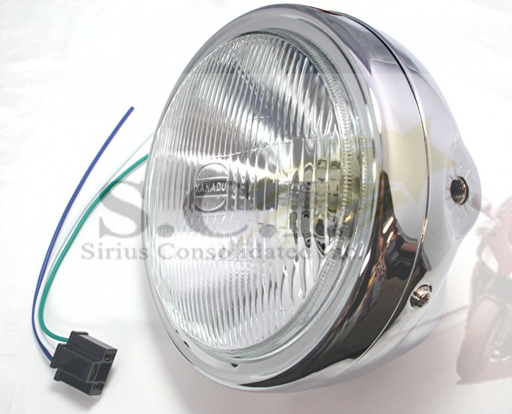 6 1/4 UNIVERSAL CHROME HEADLIGHT WITH H4 Bulb Part# 24-2917 Perfect headlight to replace the stock rusty one on your bike or to change its look. Excellent Cafe Racer piece! Details - H4 Universal Motorcycle Headlight - 7 Inch Assembly Diameter - 6 1/4 Lens Diameter - Hi/Low 55/60 watt - Replaceable H4 Halogen bulb - 3 prong plug with wires - 6 1/2 width at mounting points - Chrome headlight bucket - For Honda, Kawasaki, Suzuki, Yamaha motorcycles - Mounting holes are 10mm, mounting bolts not included. Fits Some applications may require modifications, note size of light above CB1000C CB350 CB450 CB500 CB550 CB650 CB650C CB650SCNIGHTHAWK CB750C CB750F CB750SC CB900C CB900F CBX CBX1000 CX500C CX500D GL1000GOLD WING GL1100GOLD WING GL1100GOLD WING ASPENCADE GL1100GOLD WING INTERSTATE GL500 SILVER WING GL500 SILVER WING INTERSTATE GL650 SILVER WING GL650 SILVER WING INTERSTATE