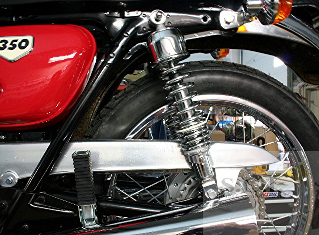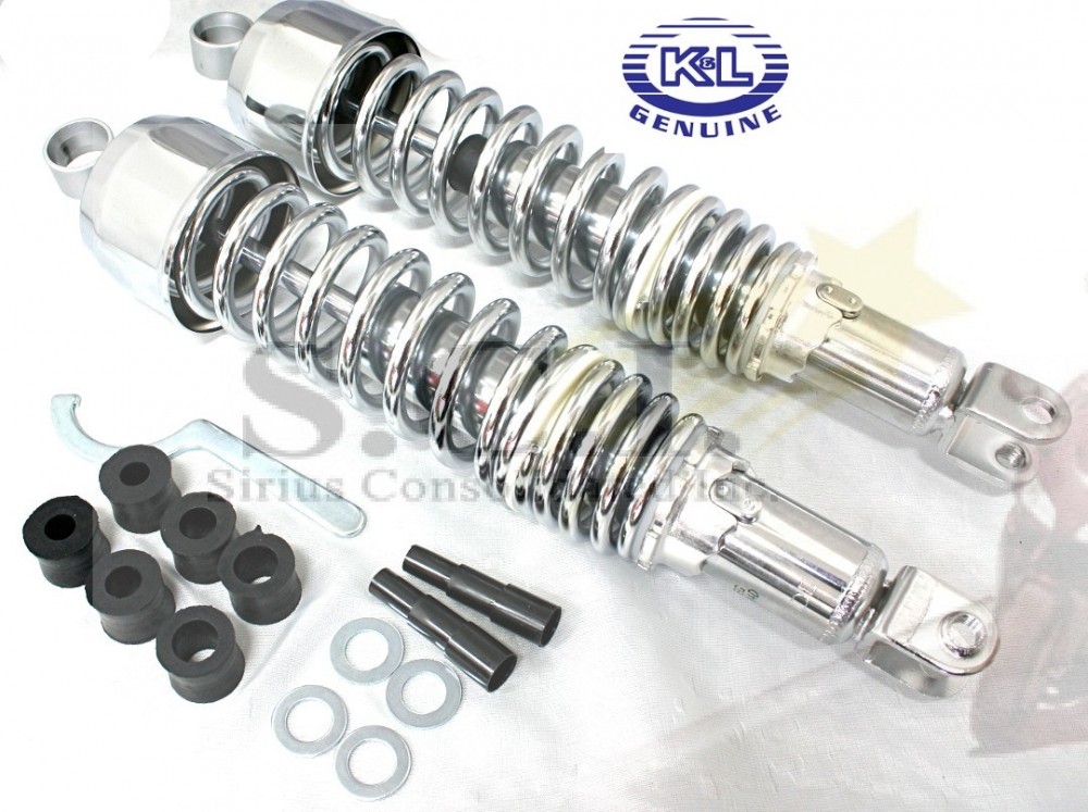 HONDA ALL CHROME REAR SHOCKS - YOU ARE BUYING 2 SHOCKS 340mm - 13 3/8 INCHE EYE TO CLEVIS Part# 31-8263 = 09-05534 Fits HONDA 1969 CL450K2 1969 SL350 1970 CB350K2 1970 CB450K3 1970 CB750K1 1970 CL450K3 1970 SL350 1971 CB350K3 1971 CB450K4 1971 CB500K0 1971 CB750K1 1971 CL450K4 1971 SL350 1972 CB350F 1972 CB350K4 1972 CB450K5 1972 CB500K1 1972 CB750K2 1972 CL450K5 1972 SL350 1973 CB350F 1973 CB350G 1973 CB450K6 1973 CB500K2 1973 CB750K3 1973 CL450K5 1973 SL350 1974 CB350F 1974 CB360 1974 CB450K7 1974 CB550K0 1974 CB750K4 1974 CL360 1974 CL450K6 1975 CB400F 1975 CB500T 1975 CB550F 1975 CB550K1 1975 CB750K5 1975 CL360 1975 GL1000 1976 CB400F 1976 CB500T 1976 CB550F 1976 CB550K 1976 CB750A 1976 CB750F 1976 CJ360T 1976 CL360 1976 GL1000 1977 CB400F 1977 CB550F 1977 CB550K 1977 CB750A 1977 CB750F 1977 CB750K 1977 CJ360T 1977 GL1000 1978 CB750A 1978 CB750F 1978 GL1000 1979 CM400A 1979 CM400T 1979 GL1000 1980 CB650C 1980 CM400A 1980 CM400T 1981 CB650C 1981 CM400A 1981 CM400C 1981 CM400E 1981 CM400T 1982 CM450A 1982 CM450C 1982 CM450E 1983 CM450A 1983 CM450E SUZUKI 1975 - 1976 RE5 1977 - 1983 GS750 1978 - 1982 GS1000 1980 GS1100LT 1980 - 1983 GS1100E 1983 GS1100SD KATANA Many other models with a 340mm - 13 3/8 INCHE EYE TO CLEVIS distance Set includes 10 12 and 14mm bushings as shown in photo GREAT PRICE FOR OEM QUALITY!!