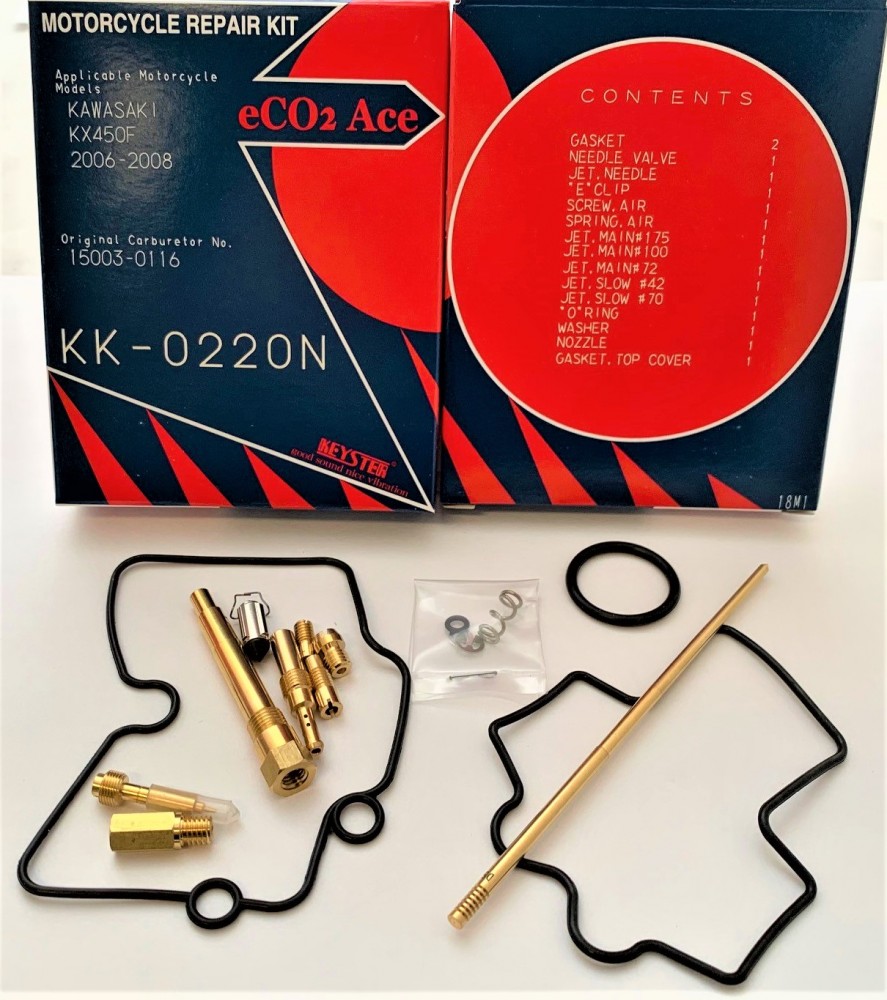 KAWASAKI KX450F KX450 KEYSTER CARBURETOR REBUILD REPAIR KIT 2006 - 2008 Part# KK-0220N Fits KAWASAKI KX450F 2006 - 2008 Kit includes Viton non swelling float bowl gasket and top cover gasket; slide needle and clip; emulsion tube; alcohol resistant float needle; #175 #100 #72 main and #70 #42 slow jets; air screw and spring; misc packing and gaskets and "O" rings as shown GREAT PRICE FOR THE BEST MADE IN JAPAN MOST COMPLETE KIT ON THE MARKET BETTER THAN OEM QUALITY!! DO NOT BE FOOLED BY CHEAP CHINESE OR TAIWAN IMITATION KITS THEY HAVE NOT PERFECTED THE RESISTANCE TO ALCOHOL IN OUR FUEL YET!! KEYSTER HAS BEEN IN BUSINESS FOR OVER 80 YEARS!!