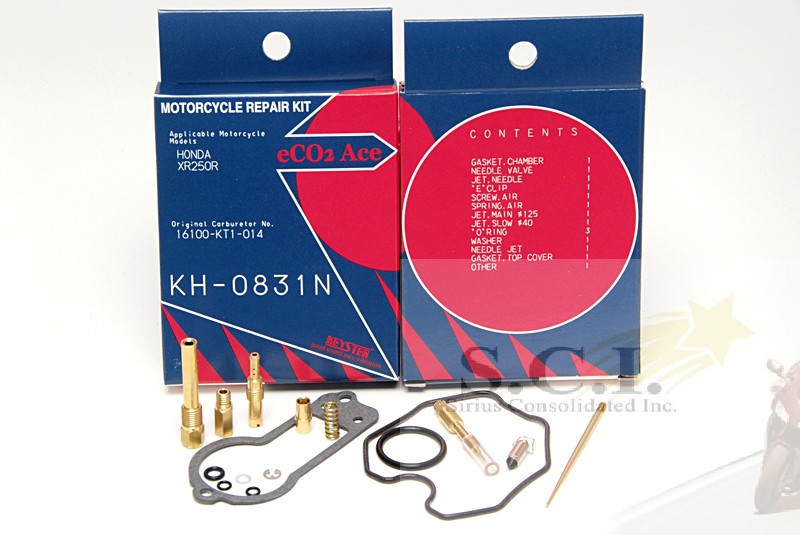 HONDA XR250R KEYSTER CARBURETOR REBUILD REPAIR KIT 1986 1987 1988 1989 Part# KH-0831N Kit includes float bowl gasket; top cover gasket; D206 slide needle and clip and needle jet; needle jet holder; float needle; #125 main and #40 slow jet; air screw and spring; misc packing and gaskets and "O" rings as shown